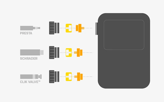 80psiまで60秒で充填できる、軽量・コンパクトな電動エアーポンプ。最大120psiまで充填可能。事前に設定した空気圧に達すると自動で停止するオートストップ機能を備えています。口金内部のパーツを組み替えることで、仏式/米式バルブの両方に対応。